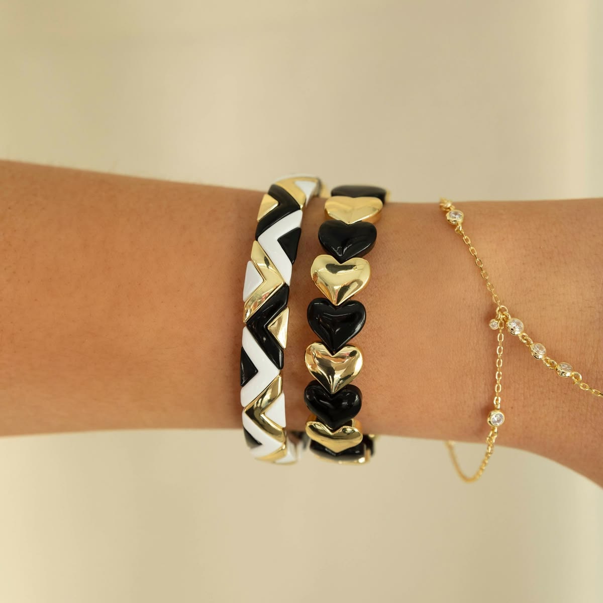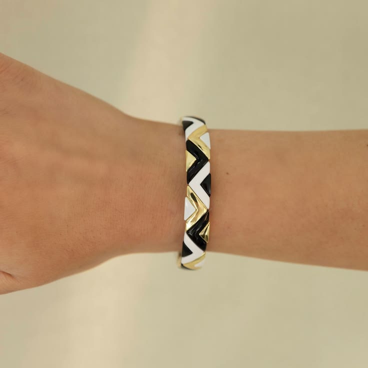 Add a bold pop of color to your stack with this eye-catching aztec enamel bracelet. Featuring glossy enamel links accented with high-shine 14k gold plating over brass, this stretchy bracelet slips on effortlessly for all-day comfort. The vibrant zig-zag design makes it perfect to wear solo or layered with your favorite Belle bracelets.