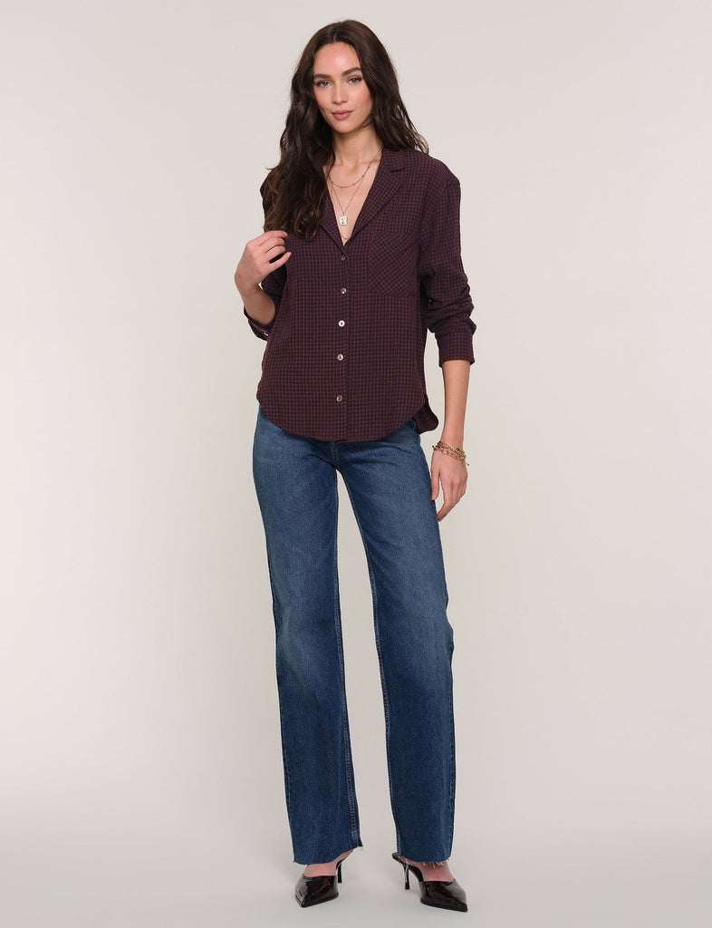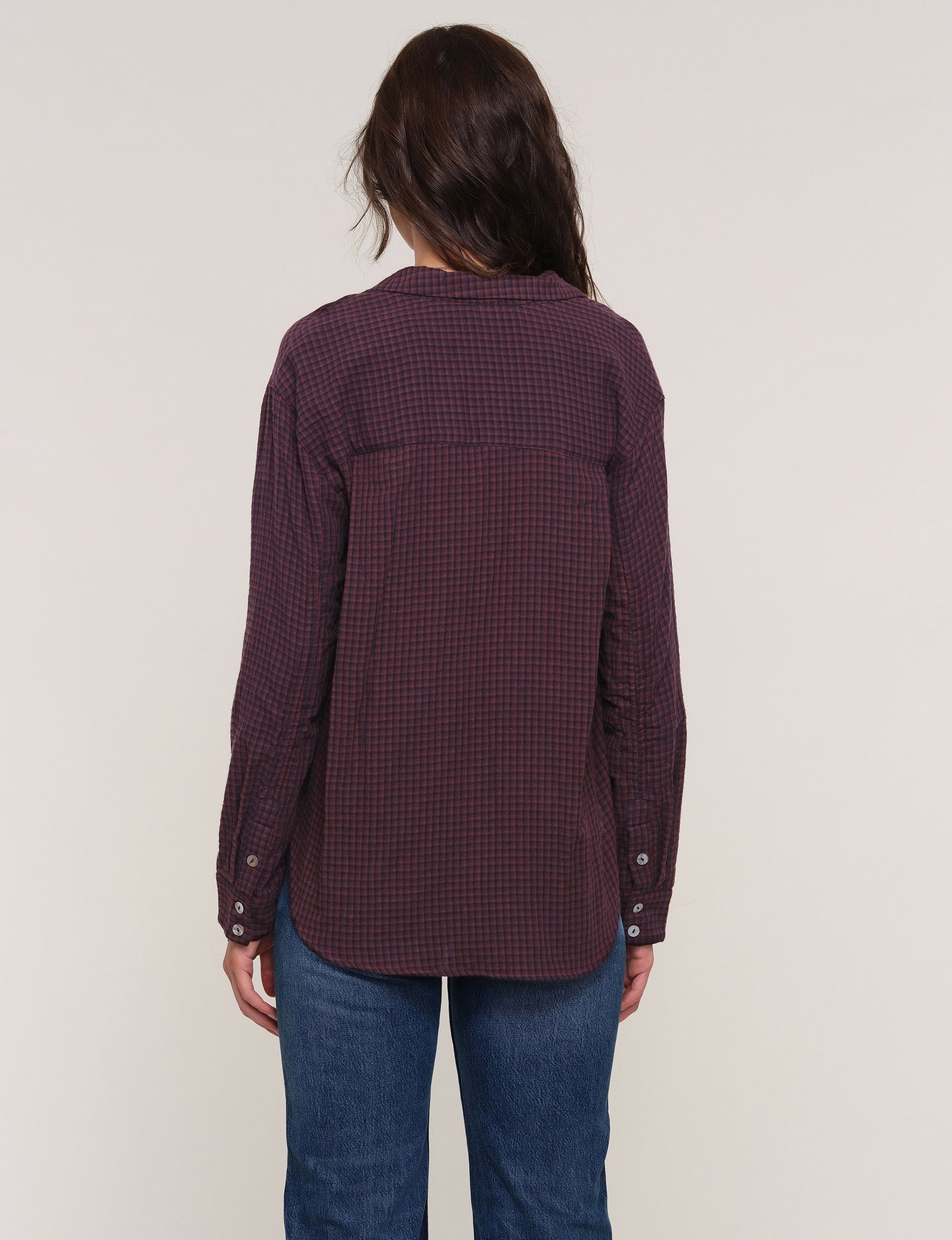 The Eren Shirt is a simple, v-neck button down shirt, with a collar and a relaxed fit. It's made from a plaid, washed cotton voile. It's casual and cool so pair it with your favorite jeans and wear it (almost) every day.
