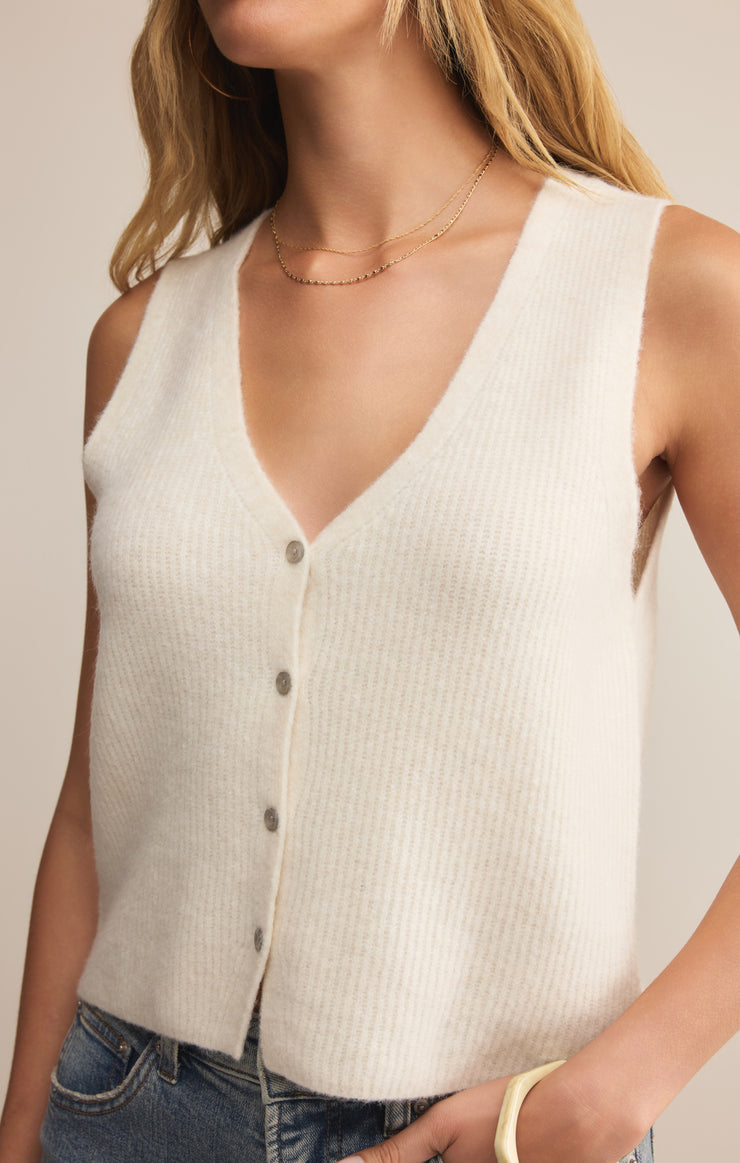 Designed in our soft Cozy Summer yarns, this sleeveless v-neck brings an airy weight and textured rib detailing. A standout piece that works solo in warm weather or layered as temps cool.