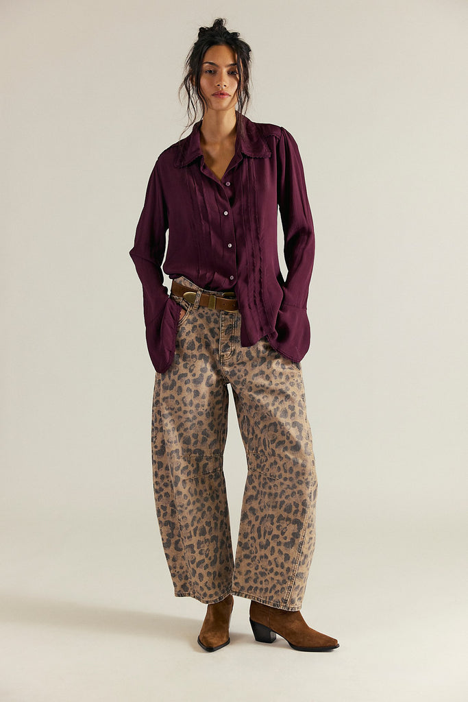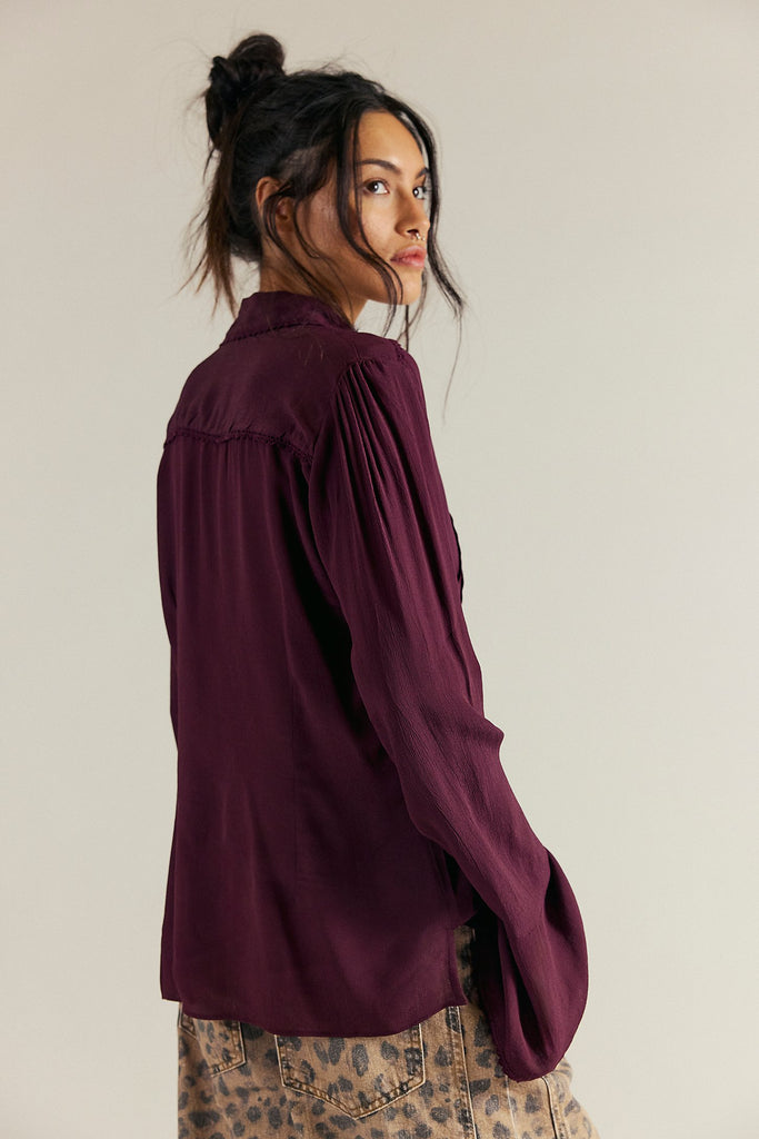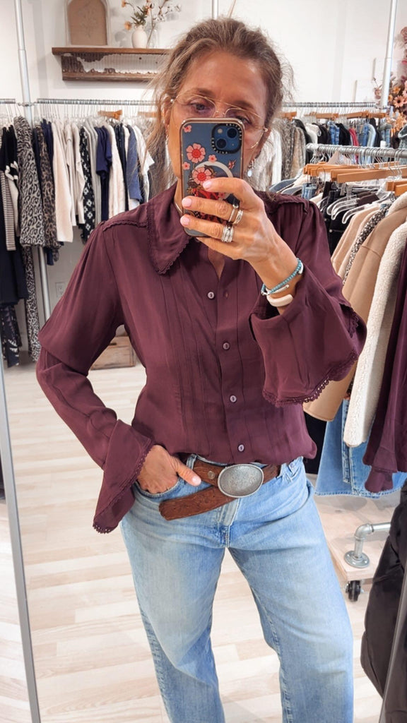 Easy and effortless, this timeless top features a relaxed button-down silhouette, billowy chiffon fabrication, and airy bell sleeves for added dimension.