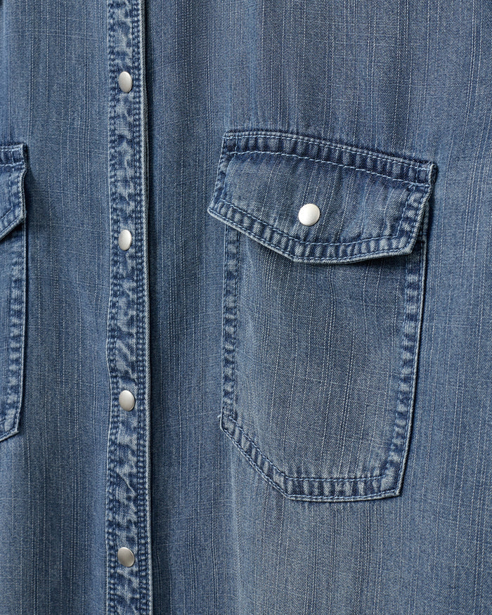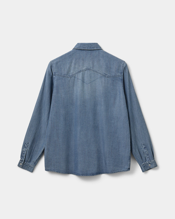 This denim shirt features a timeless, relaxed fit with a traditional collar. It includes long sleeves finished with cuffs and is secured by metal snap buttons along the front and sleeve closures.