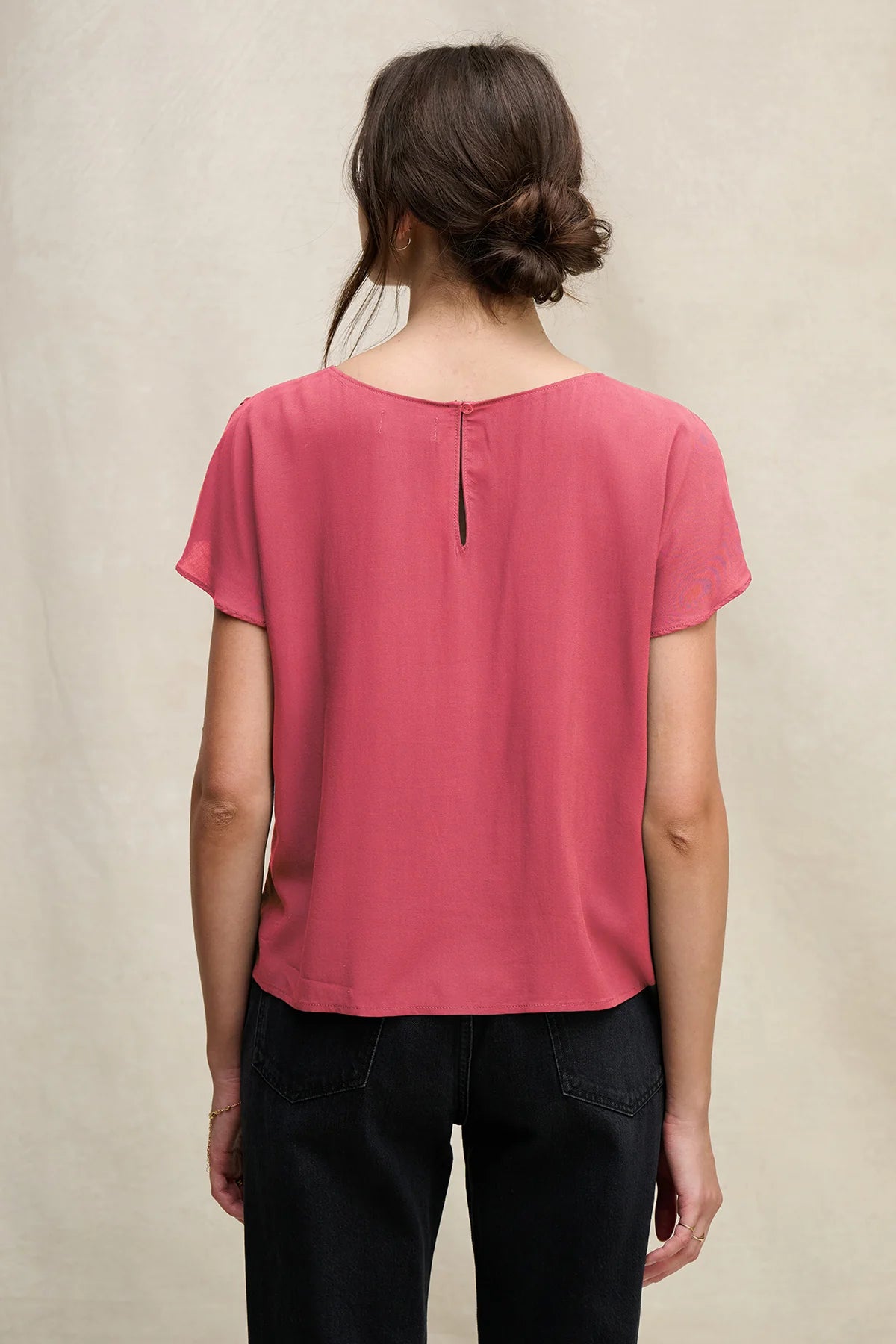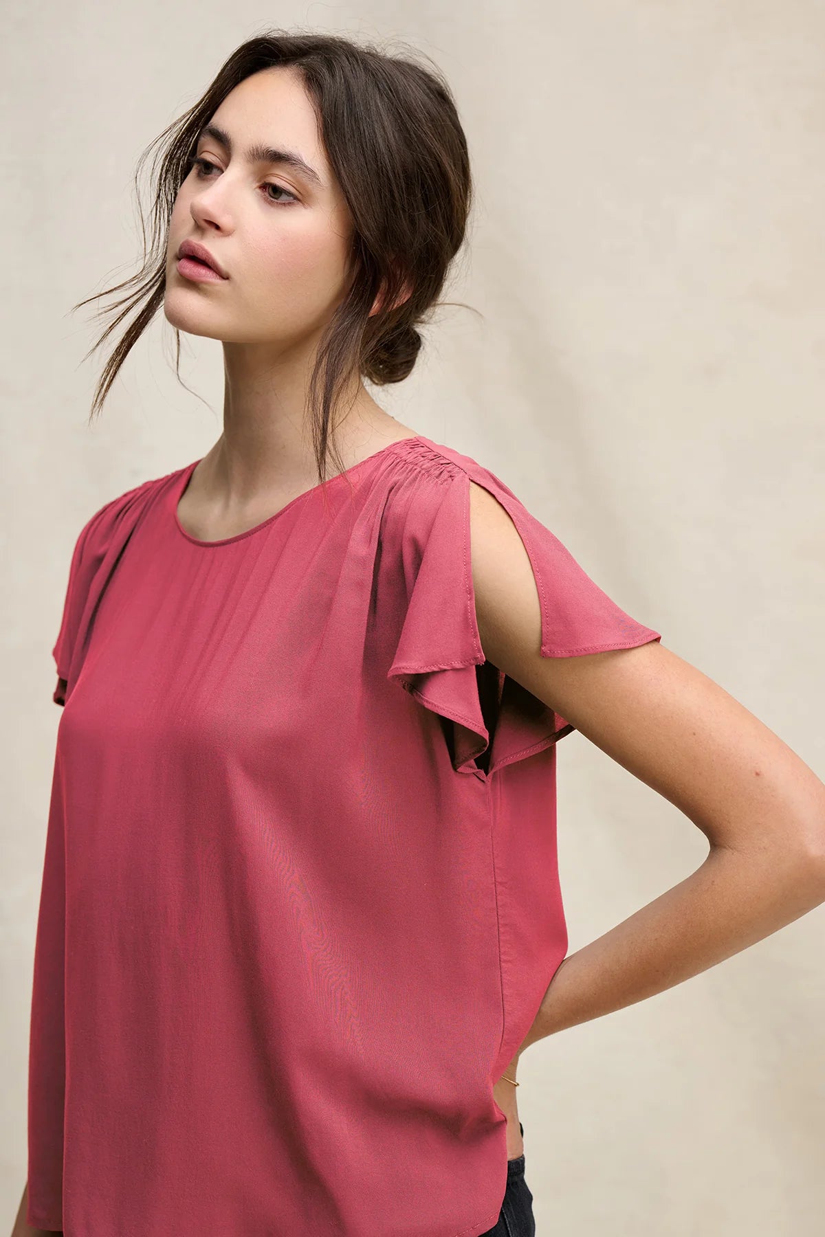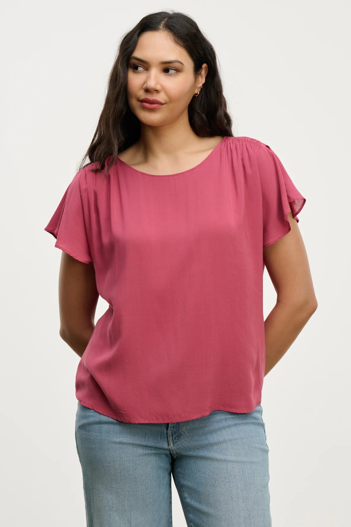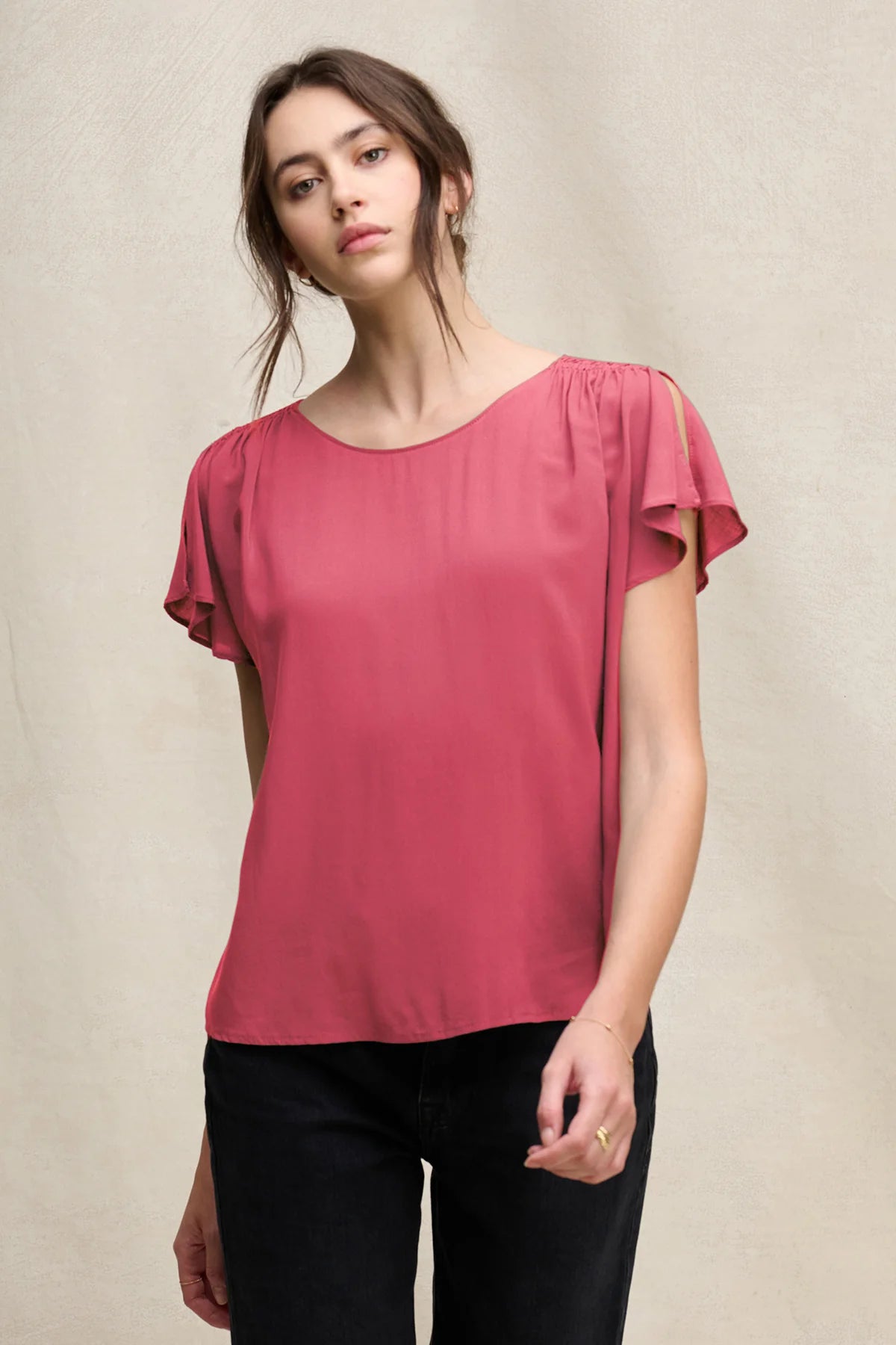 Crafted from soft rayon challis, this top features a subtle sheen with smocked shoulder detailing and delicate split accents. A round neckline and rear keyhole closure add a refined finish, making it an easy piece to dress up or down.