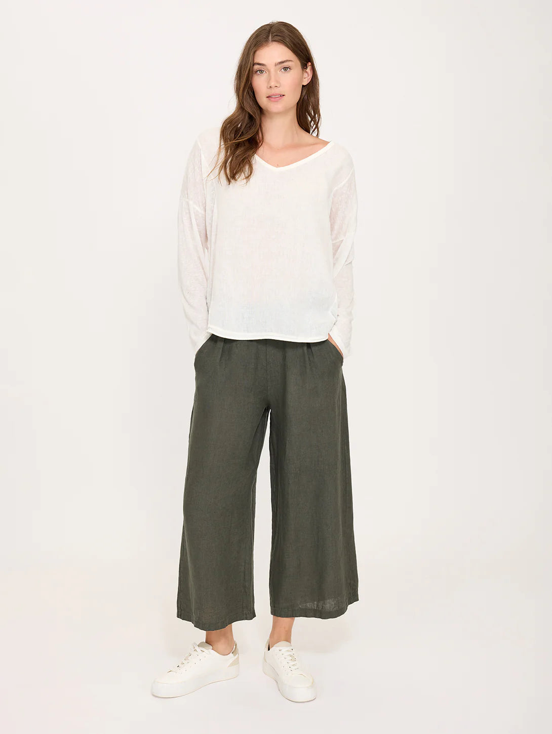This long-sleeve linen top is a refined everyday staple crafted for effortless comfort and breathability. Featuring a flattering V neckline and relaxed fit, it's designed to move with you throughout your day. The lightweight blend of linen and viscose offers natural temperature regulation, while the Italian craftsmanship ensures quality that lasts.