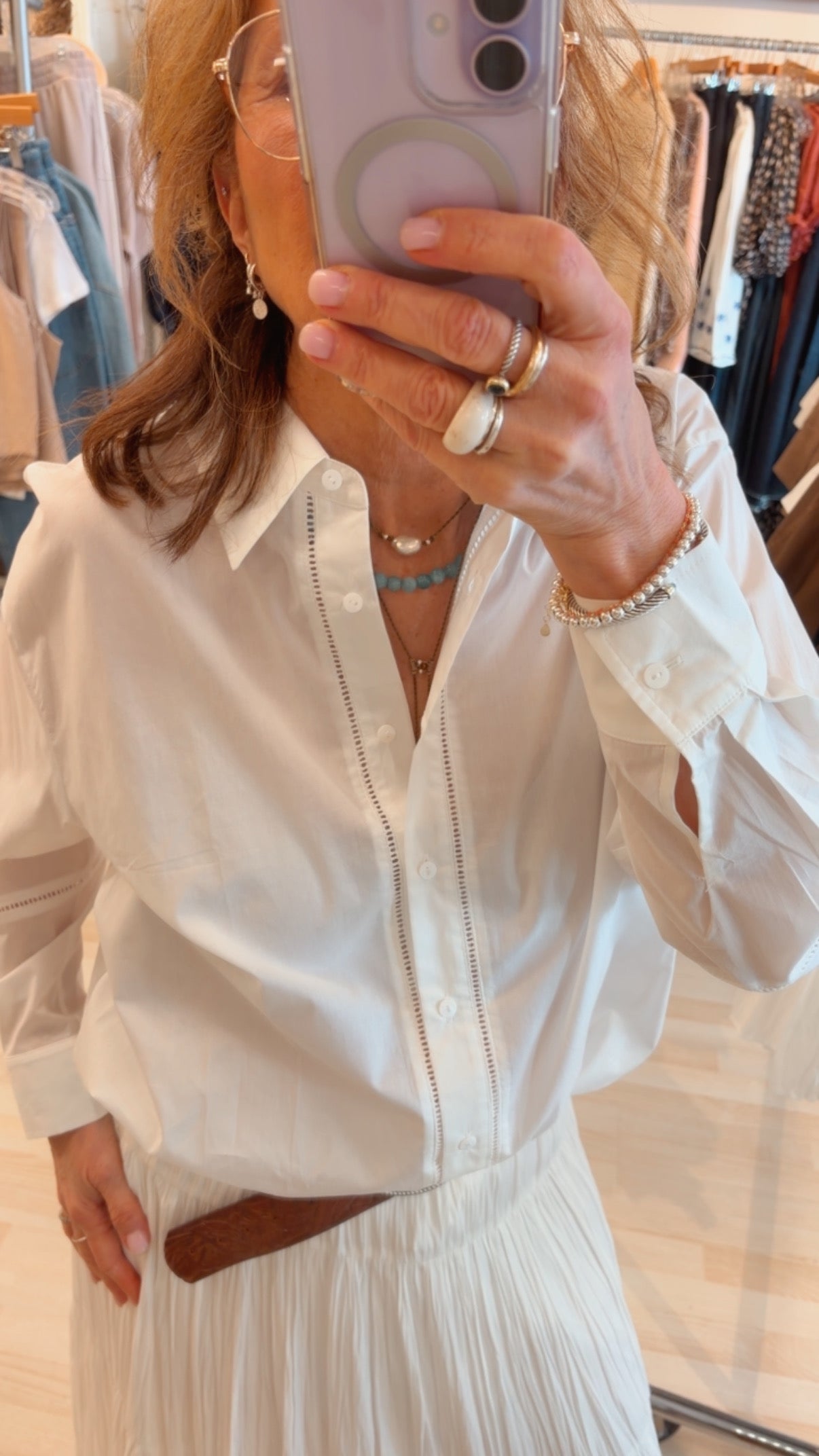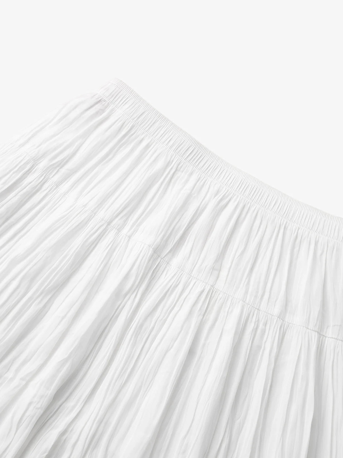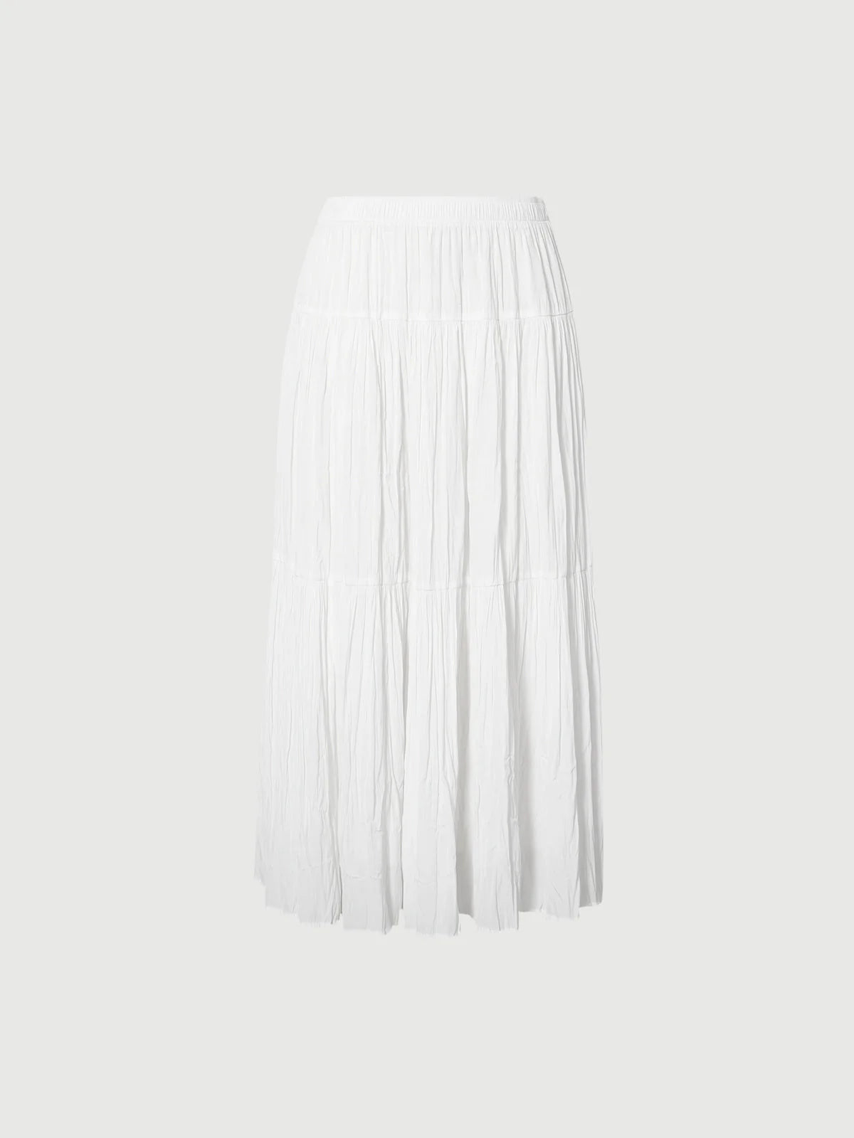 Light as air, this white midi skirt brings soft movement and a romantic touch. Made from breezy, semi-sheer fabric with a gathered waistband, it offers a relaxed fit that flows with every step. Pair it with a tucked-in tank or cropped cardigan for effortless femininity from day to dusk.