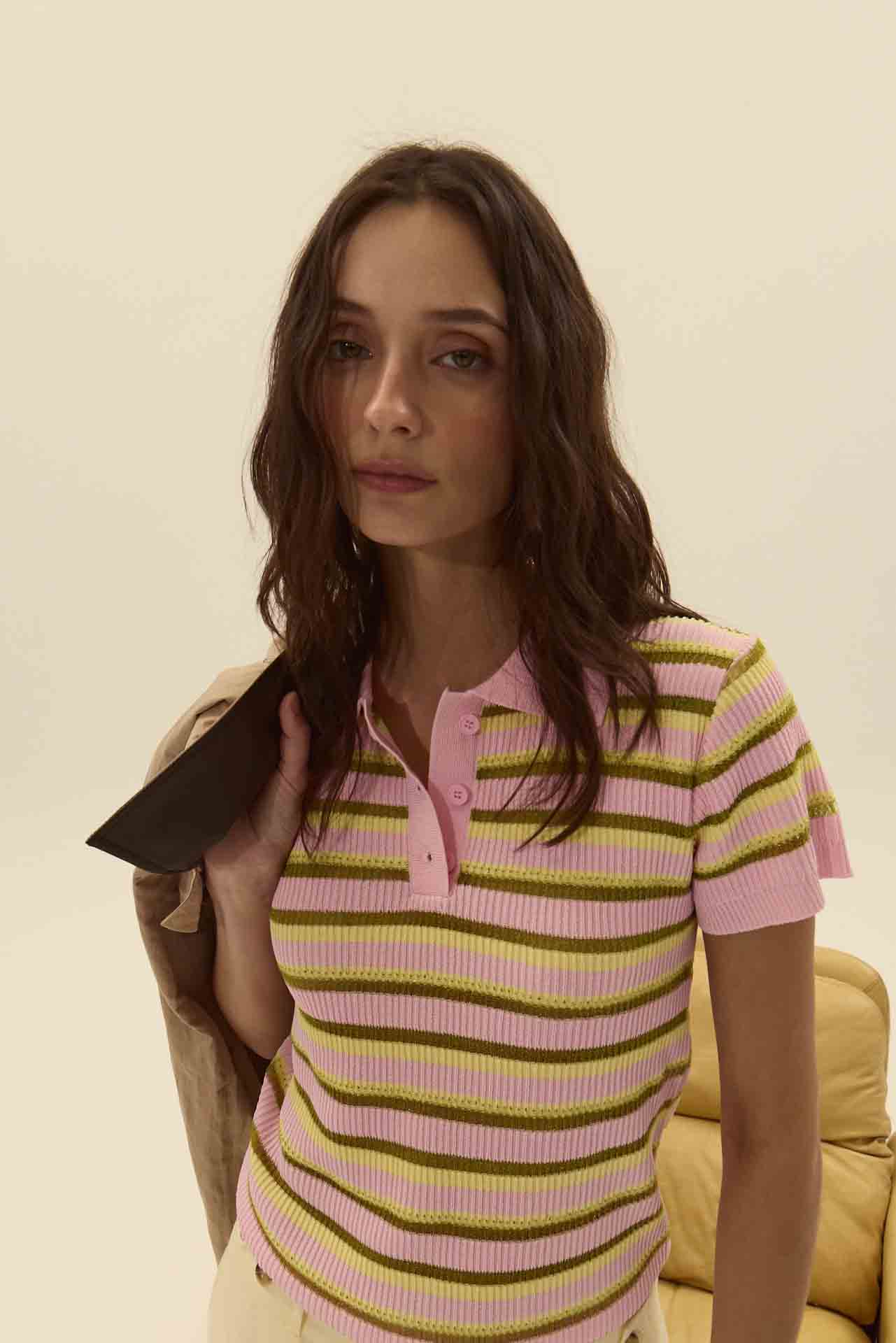Short-sleeve striped top with a polo neck and half-button placket. Ribbed trims at the sleeves and hem. Stripes are created using a mix of knits, including a sheer, slightly shiny yarn for subtle texture.