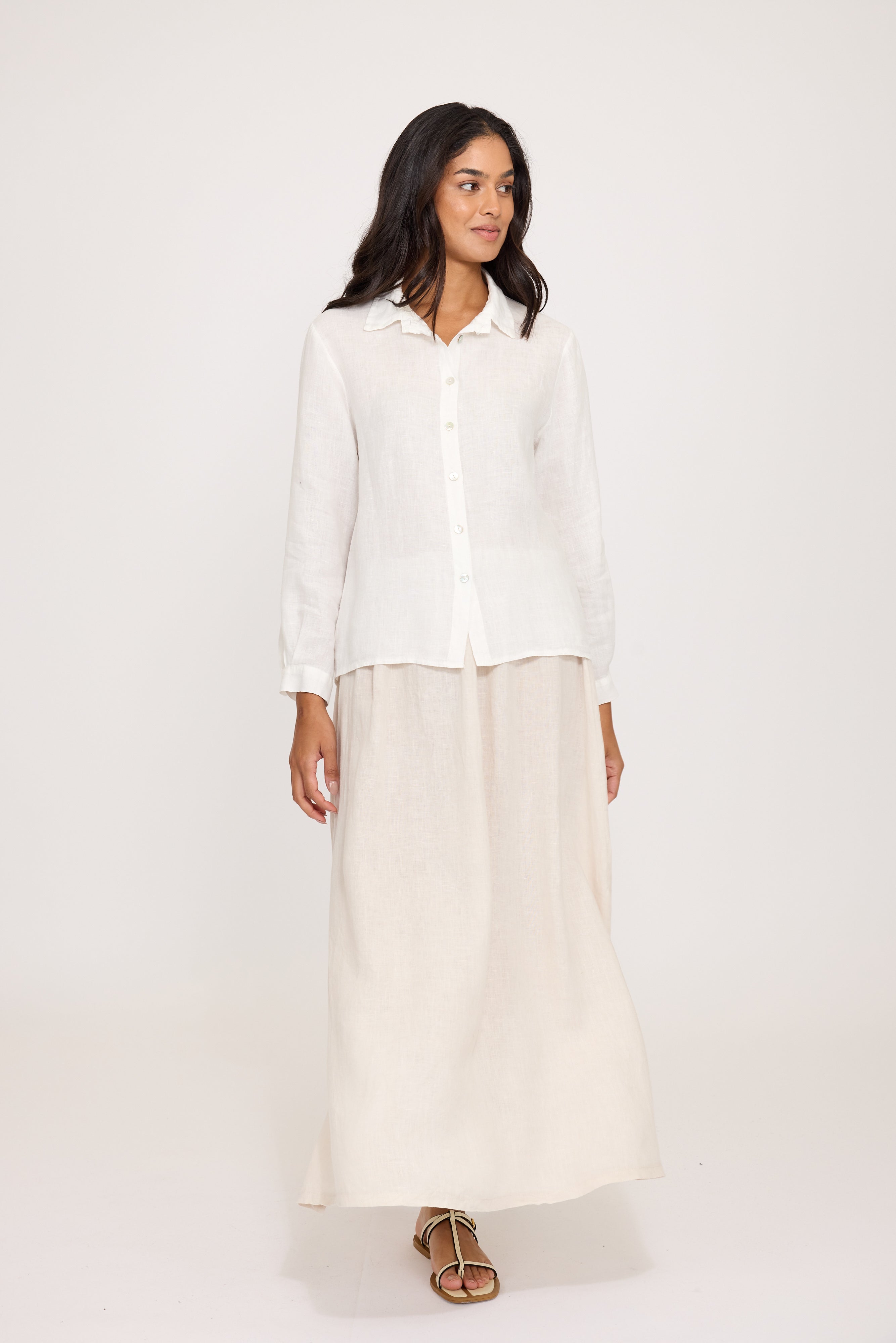 Effortlessly elegant, this Market Blouse features a refined slim fit in breathable linen. The crisp collar and lustrous mother-of-pearl buttons add timeless sophistication to your everyday wardrobe. A versatile staple that transitions seamlessly from casual to polished occasions.