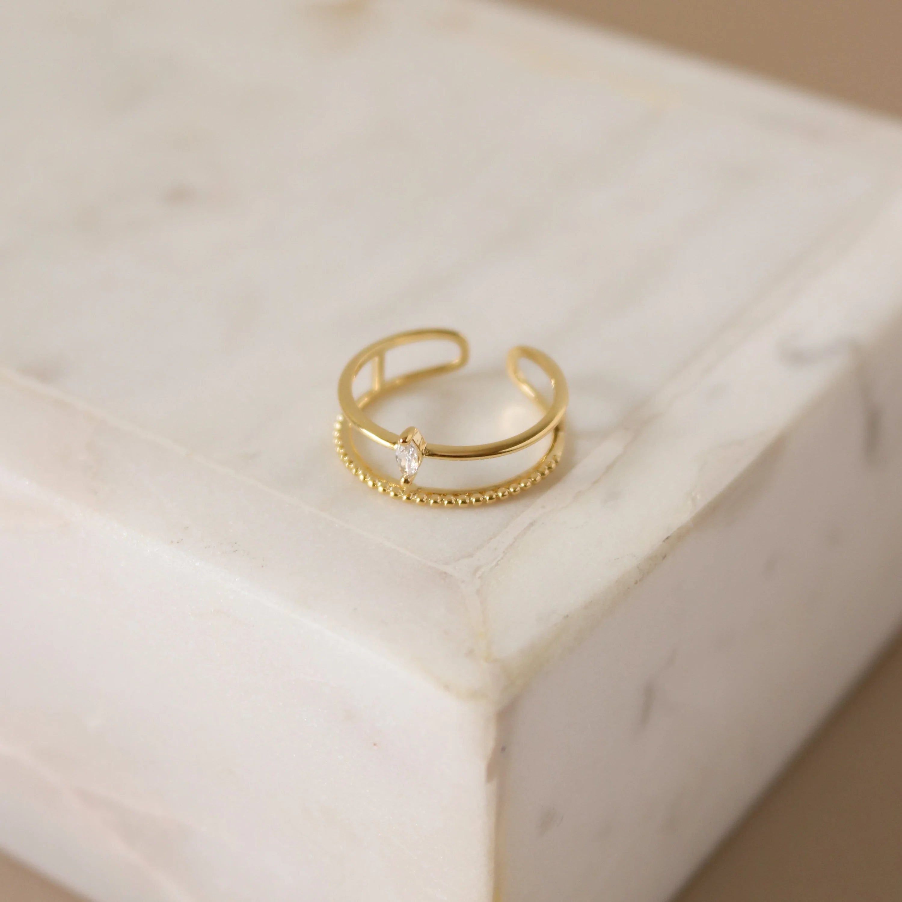 The Orbit Ring, reminiscent of the rotation of planets, creates an effortless stacked look that's out of this world. This gold-plated ring is an open style for easy wear.