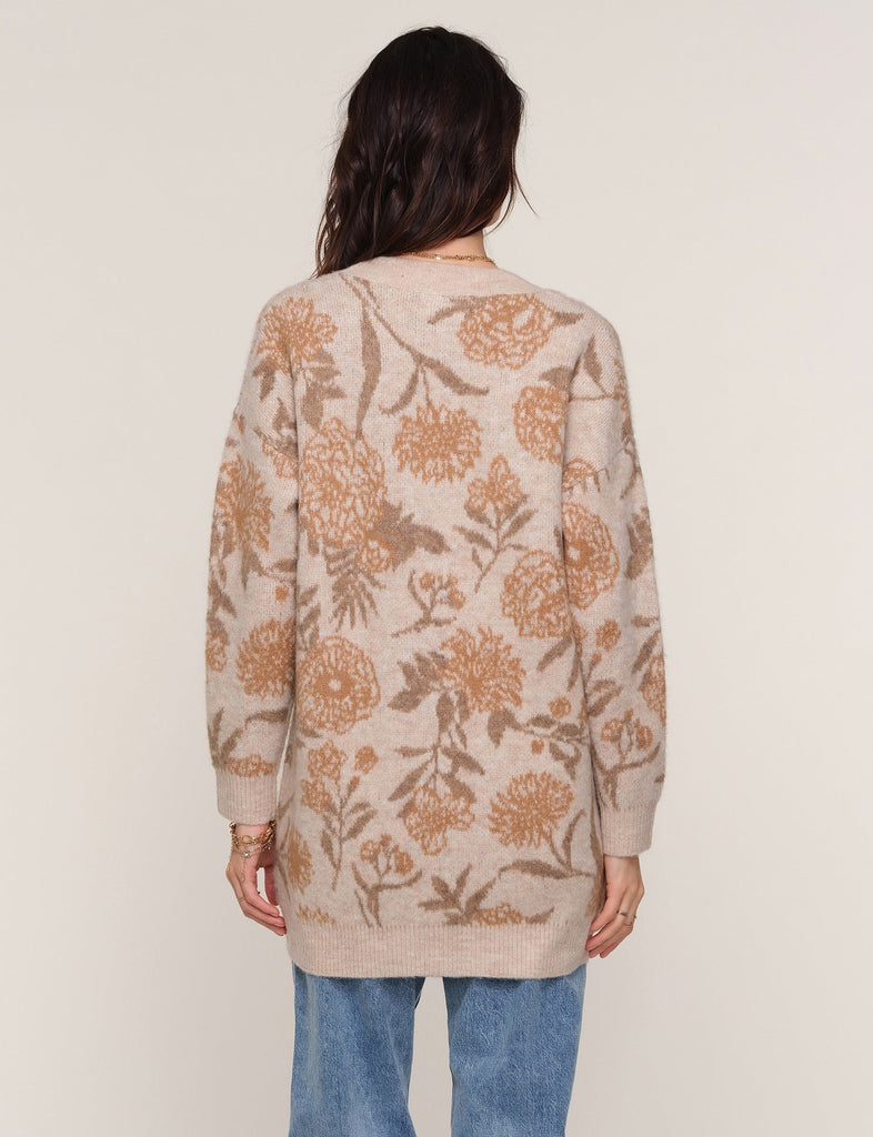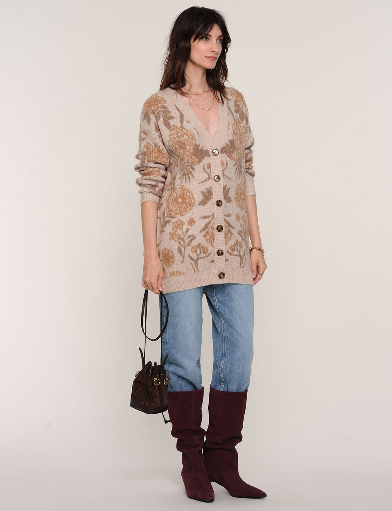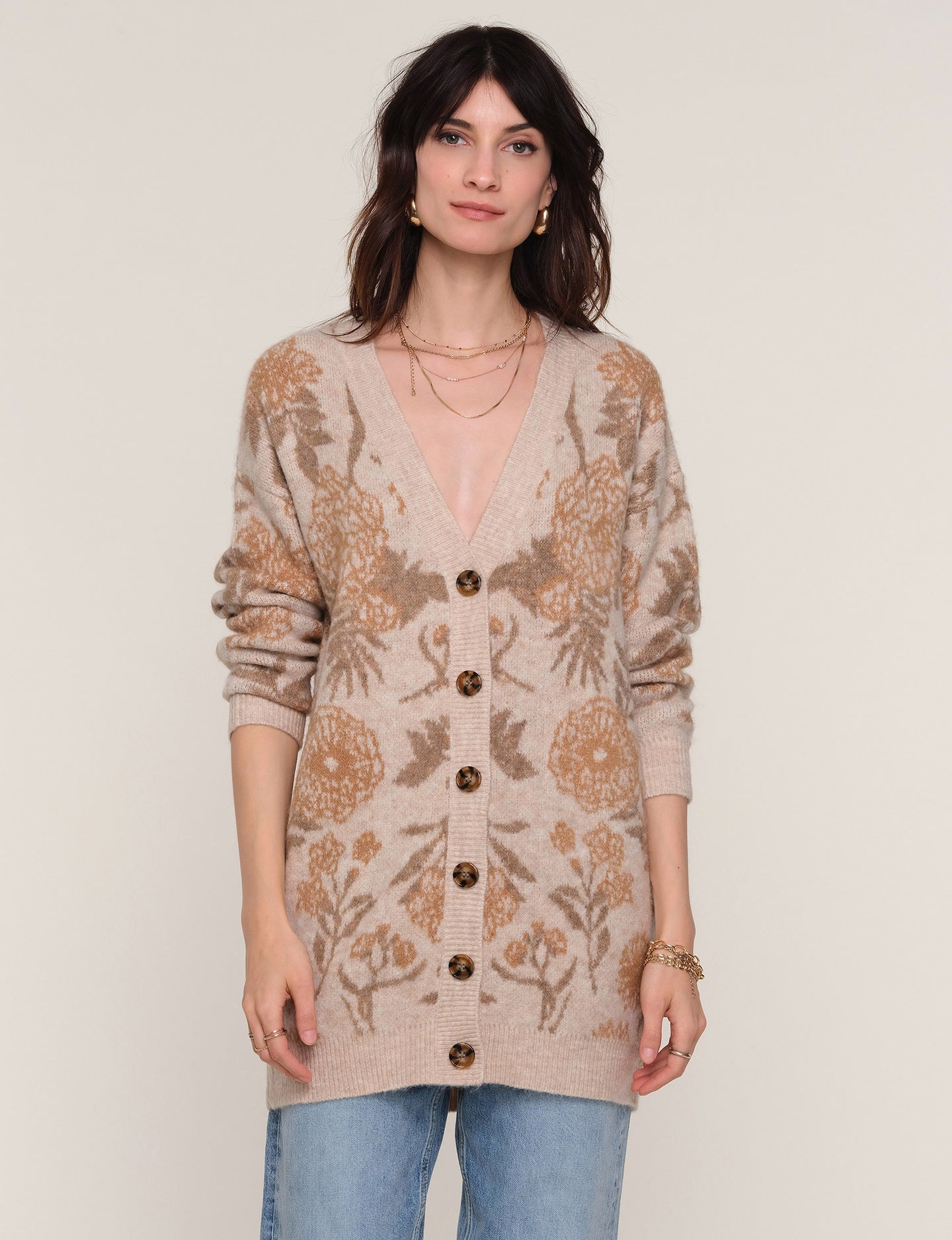The Ryan Cardi is a long-line fit knit. It features an all-over jacquard pattern, with a solid rib trim. We love it worn over a plain white tee with jeans.