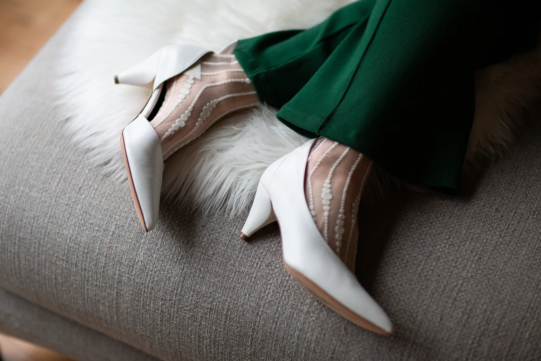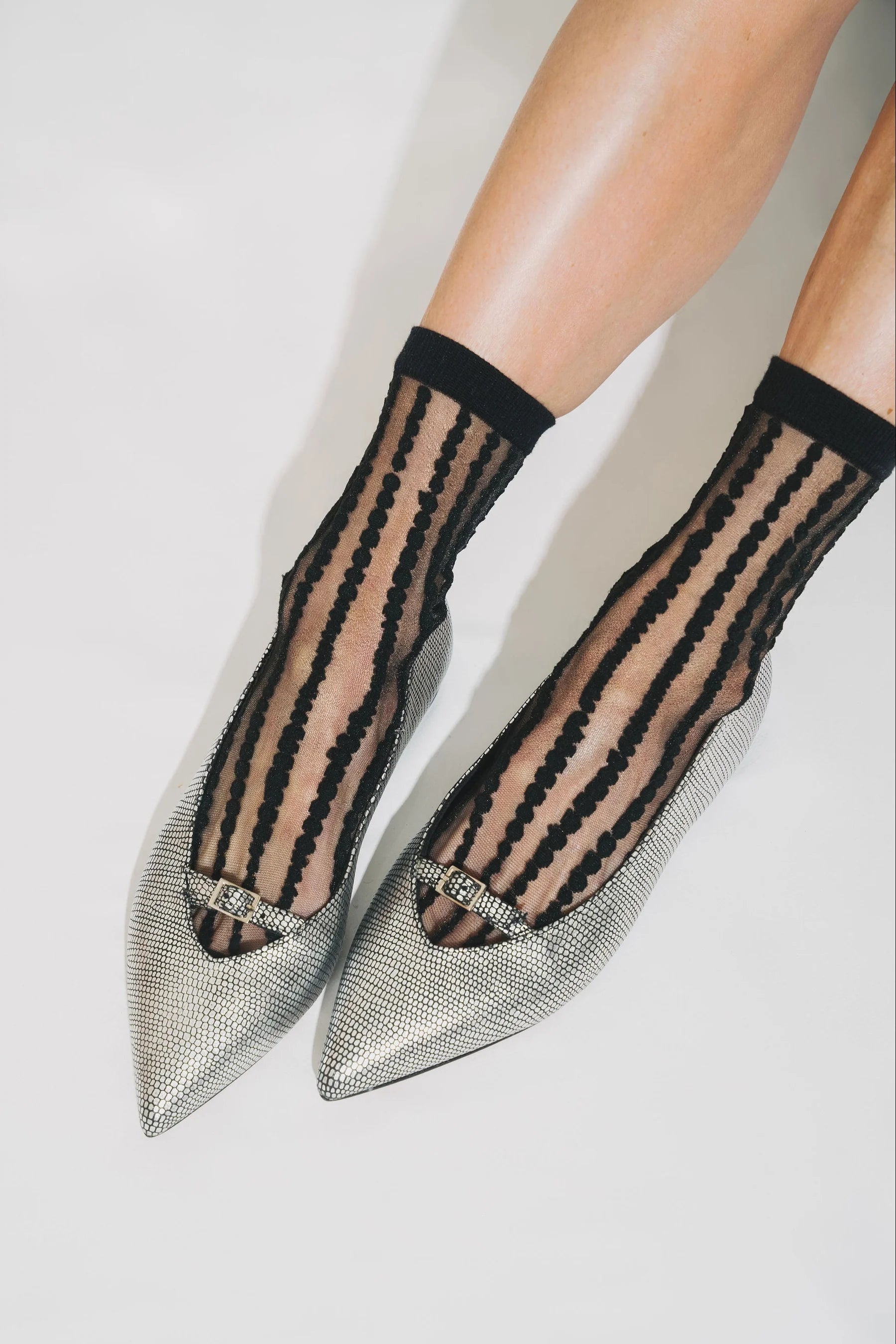 Elegant and unique, these sheer crew socks are patterned with strands of delicate bubbles in varying sizes—reminiscent of sparkling champagne. Available in timeless Black, soft Ivory, and a rich Merlot hue, they bring an effervescent touch of luxury to any look. For best care, hand wash or use a delicate cycle.