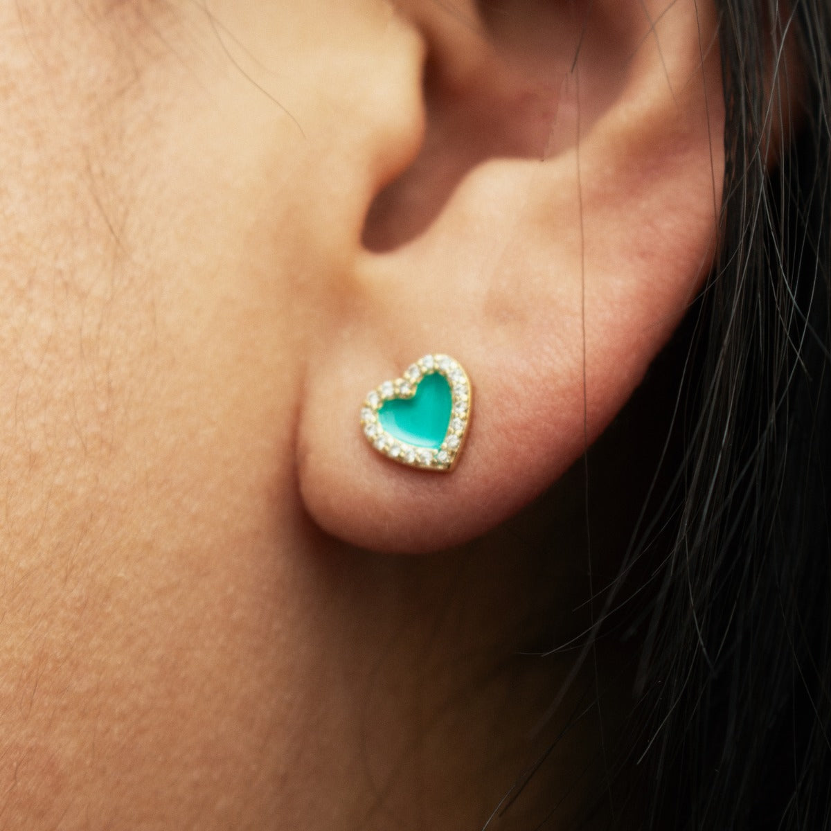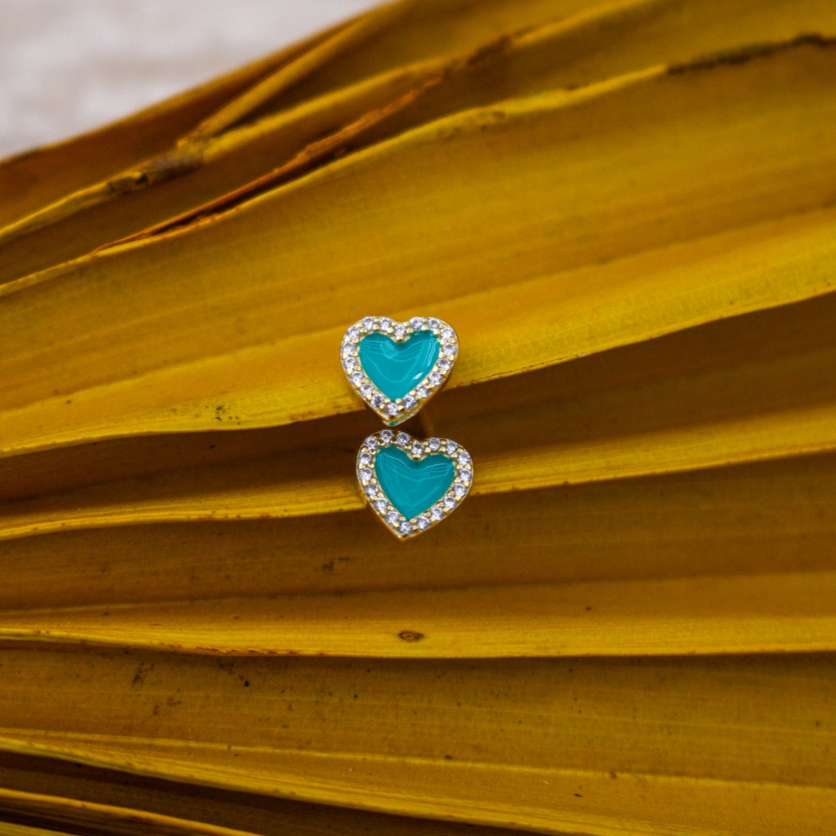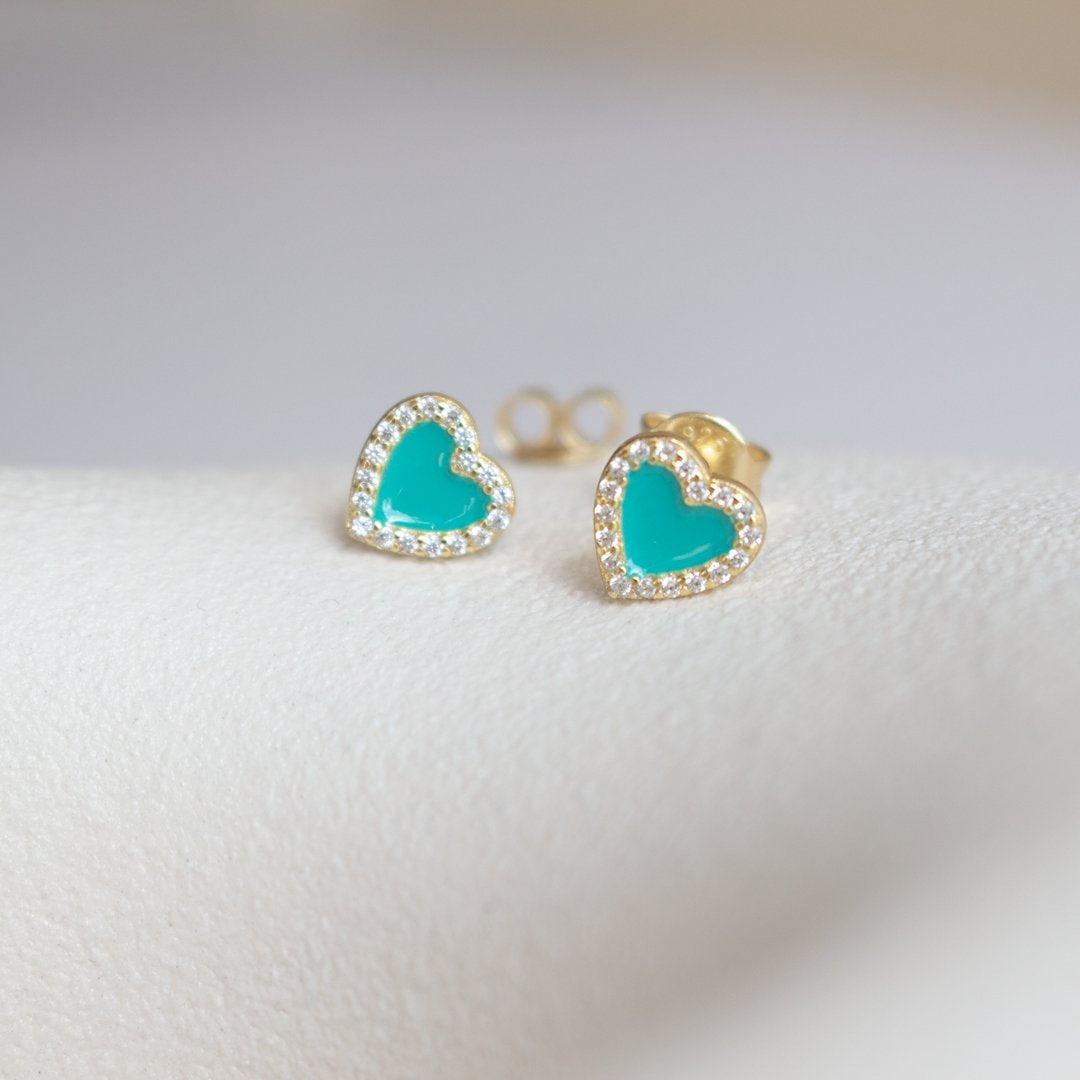 Elegant heart stud earrings featuring vibrant turquoise enamel framed by a sparkling crystal halo. Crafted from sterling silver with luxurious gold plating, these timeless pieces offer a sophisticated pop of color. Secure butterfly back closures ensure they stay in place throughout your day.
