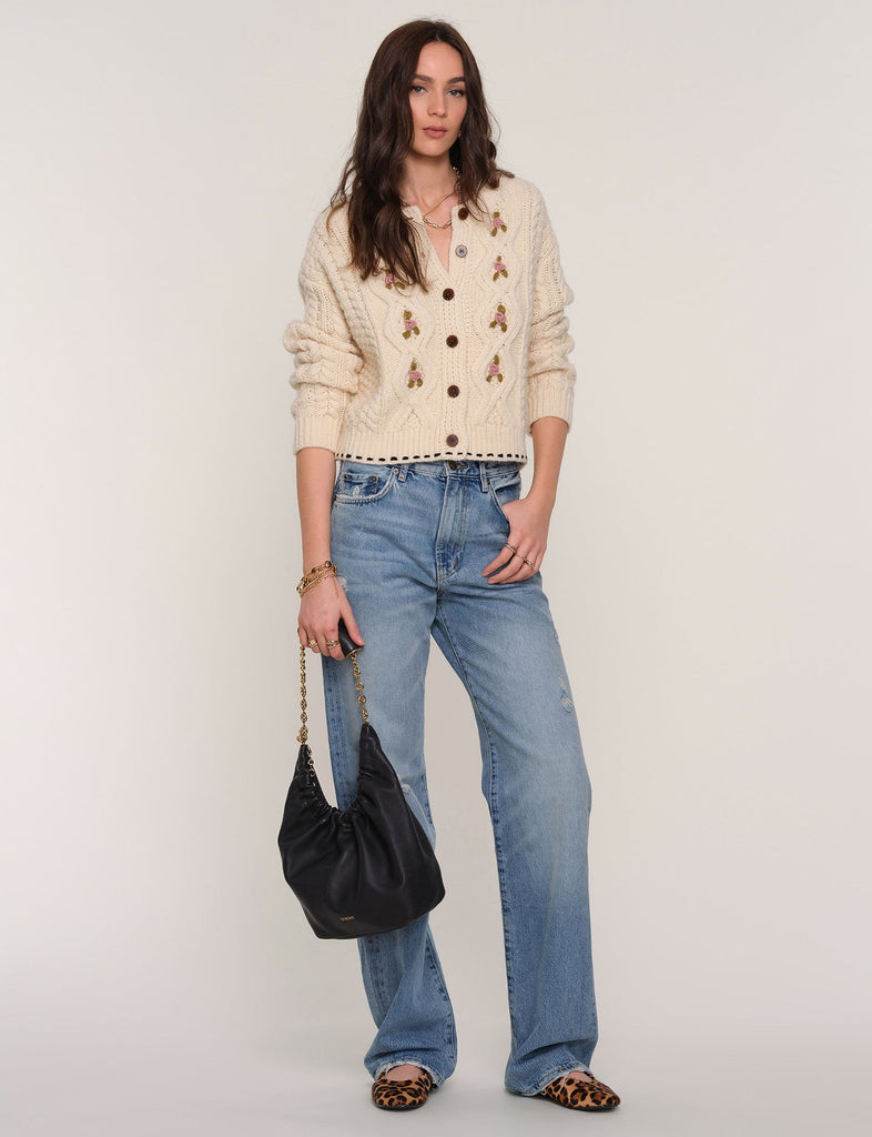 The Veda Cardi is a pretty, feminine knit. It features floral embroidery, cable stitching and a relaxed fit. We love it worn over a white tee with a pair of straight cut jeans.